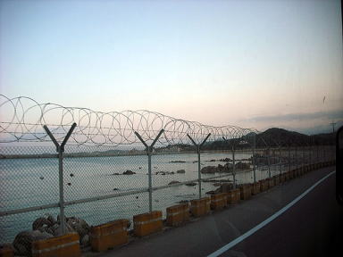 | 束草(そくちょ)で乗ったタクシーは市街地を抜けると高城へ向けて快走した。高城が近くなると道路の要所々々に軍服姿の兵士が立っていて、軍用トラックが行き交っている。そして、道路の際にはコンクリートブロックが積み上げられていて、横断歩道橋のようになっているものもある。有事にはこれらを爆破して崩壊させて道路を封鎖して、北の侵入を防ぐのだと運転手は説明してくれた。さらに海岸線には北の工作員などの侵入を防ぐために有刺鉄線を這わせたフェンスが設けてある。 |