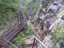 | 深夜に小屋の外に出た時は束草(ソクチョ)の街の灯りが見えたが、明け方になって雲行きが変わり今にも降り出しそうなどんよりした空模様である。そのため、朝食は少し下ってから摂ることにして午前6時に出発することになった。 20分ほど下ると日本の山では見られないようなすごい岩肌の小青峰が現われた。でも、岩はもろそうだ。岩場の道を1時間半ほど下った喜雲閣の山小屋でカップラーメンの朝食、このとき飲んだドリップのコーヒーはなぜか大変美味しかった。 この後、ほんの一時小雨が降ってきたが汗をかいた肌にはむしろ心地よいものであった。千仏洞渓谷沿いの下山道はよく整備されていて鋼鉄製の階段がいたる所に架けられていて滑り止めも付いている。岩場の道は程よい段差で浮石がなくて歩きやすい。紅葉シーズンには少し早いが所どころ紅葉している。紅葉の盛りにはもっときれいだろうと思いながら下る。 ここの下りで3人グループの韓国人と抜きつ抜かれつしているうち親しくなり、日韓の山男7人がいっしょに下山口 神興寺に着いたのは午後1時だった。一気に1400mも下り膝はガクガクになったが、楽しい山登りであった。 |