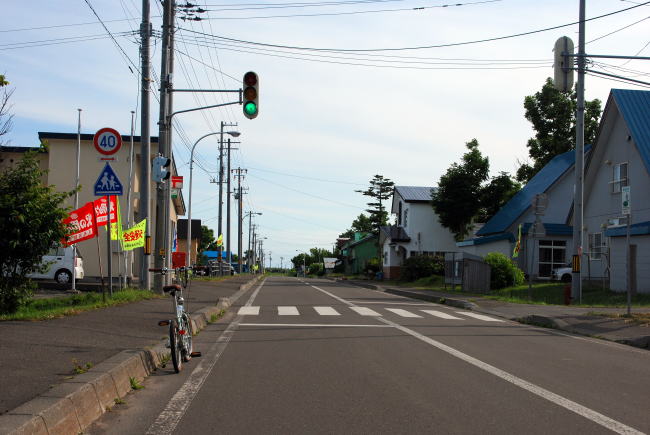 | 車の通行はほとんどないのに、学校入口の道道548号天売島線にはこの島唯一の信号機が設置されている。子ども達が本土へ行ったときに戸惑わないようにとのものであり、島の人たちは北海道本島のことを”本土”と言い、本州のことを”内地”と言っている。 島を離れるときに立ち寄ったフェリー乗り場の前の土産物店の店主は「交通信号機が設置されたのは私が交通安全指導員をやっている時だった」と言っていたが、こんな島にも交通安全指導員がいることに妙に感心した。 |