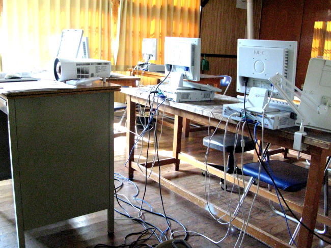 | 教師はパソコン・ルームにも連れて行ってくれた。パソコンの授業は生徒全員で受けるとのことで8台のデスクトップのPCが備えられている。教壇にはプロジェクターもあって設備は充実している。無論プリンターも用意されていました。 |