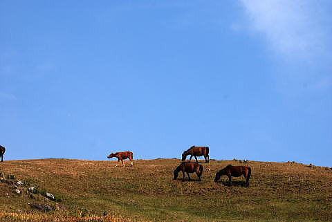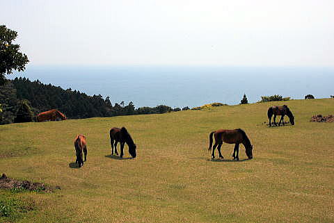 都井岬は、江戸時代に高鍋藩が軍馬の生産を目的として牧場を設けたのが始まりとされている。体高120〜130cm,体重250〜300kg程度で、当時の武士の馬が品種改良されずに生き残り野生化したのが岬馬です。 |