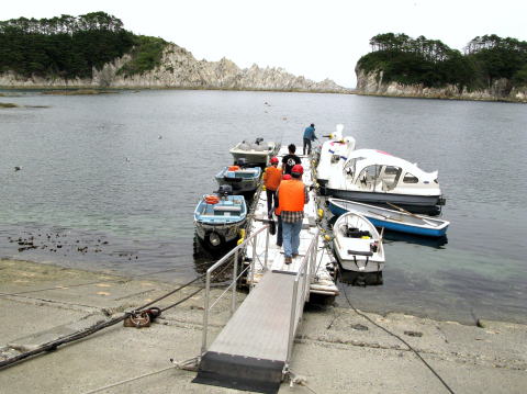 | 2時間ちょっとで宮古に着いて、駅前からバスに乗って浄土ヶ浜に着いた。浄土ヶ浜は昔坊さんが「さながら浄土のごとき光景」と呟いたことがその名の起こりと言われている。遊覧船に乗ろうかと思ったが、青の洞窟を巡るサッパ舟という小さな舟に乗った。 |