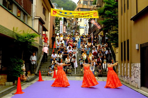 | 渋川市はハワイ州と姉妹都市提携を結んでいてハワイの伝統文化を紹介するなどしている。 たまたまこの日は、その一環で石段街ではフラダンスのフェスティバルが行われていた。東京や千葉から来たフラダンス好きの昔の乙女が大勢踊っていました。 |