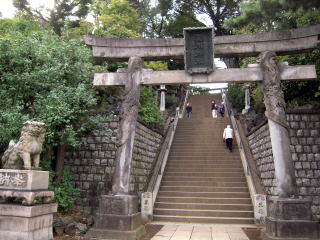 | 京浜急行北品川駅を出るとすぐ前が第一京浜国道で、左方向に品川神社の鳥居が見える。鳥居をくぐって急な石段を上がって行くと、品川富士の入口の鳥居が建っている。 |