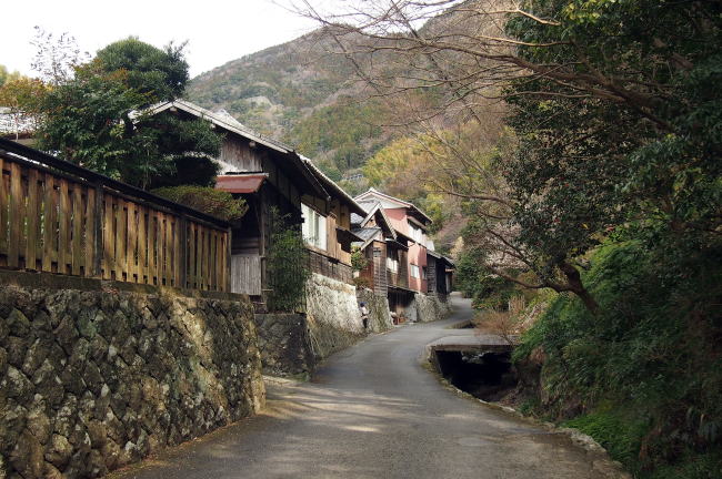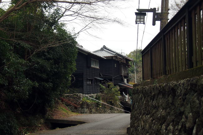 | つい先年までは林業、ミカン、お茶の栽培などを生業としていたが、特に明治後期には、輸出用のミカン産地として大いに栄え、ミカンの収穫期に雇用した人々の宿泊施設として、このような構えの農家住宅が形成されていったという。 裕福そうな集落で、大きな主屋、長屋門や付属建物も全て黒板貼りの景観は見事なものであった。 |