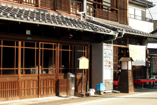 | 旅籠「和泉屋」(鈴木家) 国登録有形文化財 天保年間(1830年代)に建てられた建物で、安政の大地震でも倒壊を免れました。今に残る2階の櫛形の手すりや看板かけ、柱から突き出た腕木など江戸時代の旅籠の面影が表れています。 弘化2年(1845)の蒲原宿商売調べ帳には、「和泉屋間口間数六・一」とあり、現在は鈴木家4.1間、お休み処2間の2軒に仕切られています。 |