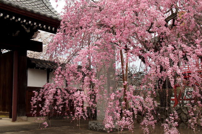 | 栃木県佐野市の西光院は、佐野七福神の一つ毘沙門天を祀るお寺で、山門の脇にあるべにしだれ桜は樹齢400年の古木です。このお寺には淡墨桜の孫桜、河津桜の孫桜があるが花の盛りを過ぎてしまっていました。 ( 平成27年4月3日 ) |